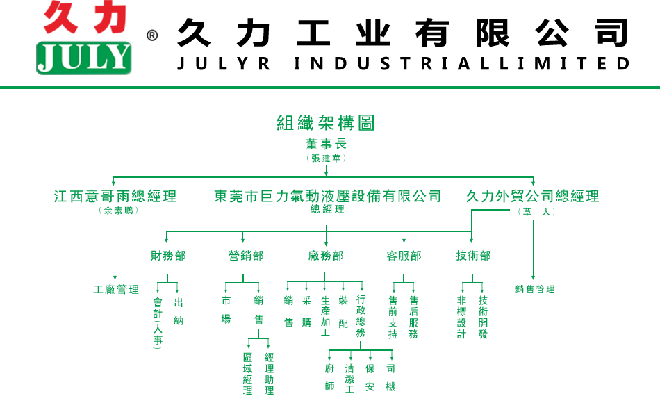 東莞巨力氣動液壓設(shè)備有限公司 東莞巨力氣動液壓設(shè)備有限公司是一家專業(yè)從事于:氣液增壓缸、氣液增壓器、CNC打刀缸、氣動沖床及氣液增壓(液壓或伺服驅(qū)動)設(shè)備的專業(yè)性生產(chǎn)廠家!工廠在大陸地區(qū)始建廠于2006年3月,現(xiàn)始今在東莞工廠占地面積8000平方米左右,工廠及辦公面積3000平方左右,宿舍生活區(qū)在1000平方左右;工廠自有3臺CNC加工中心、3臺全自動車銑復(fù)合機(jī)、6臺數(shù)控車床及普車普銑等設(shè)備一批;2014年公司因為發(fā)展需要在江西九江投資購置40畝工業(yè)用地,正在建立新的工業(yè)園區(qū)!